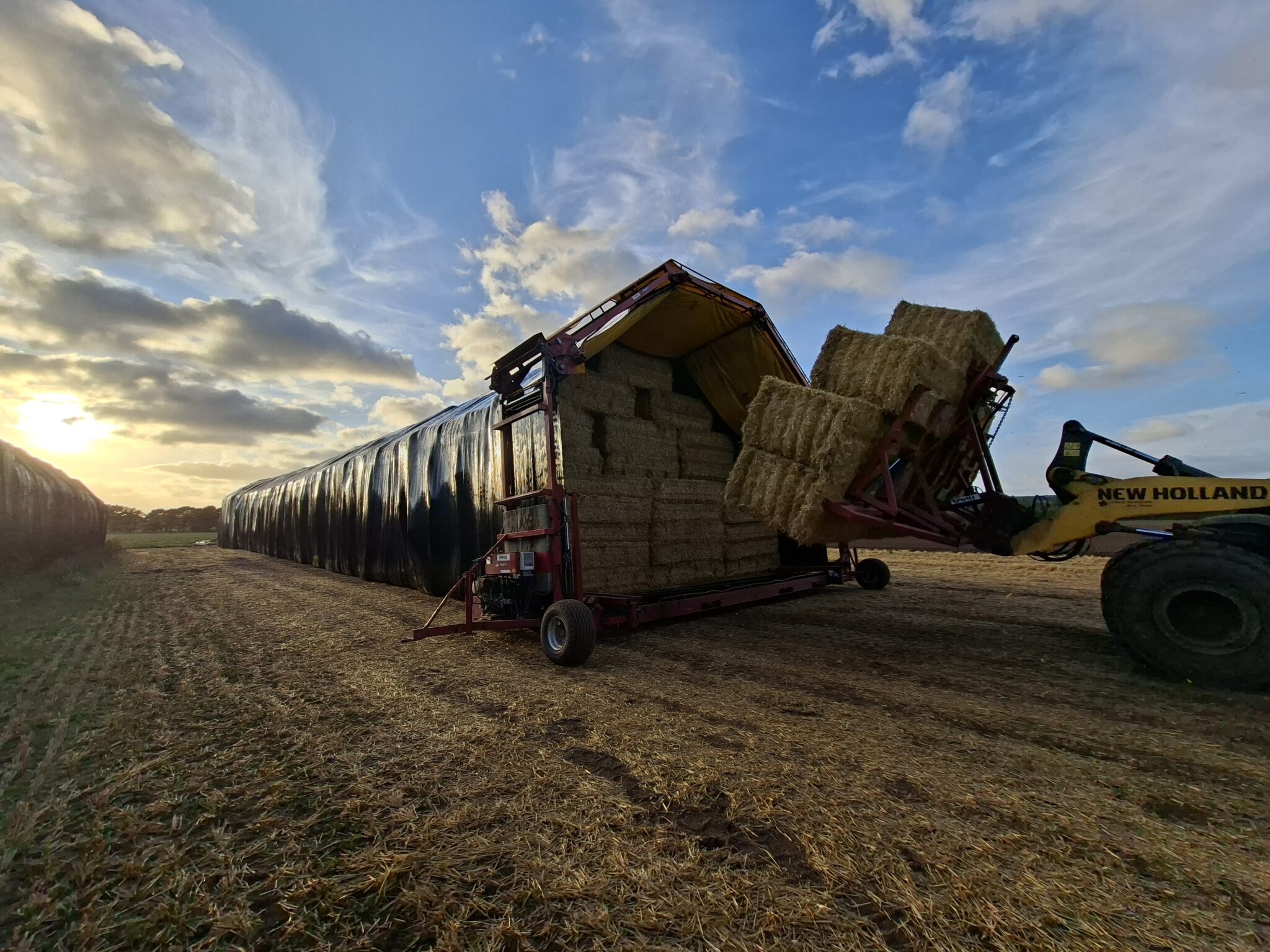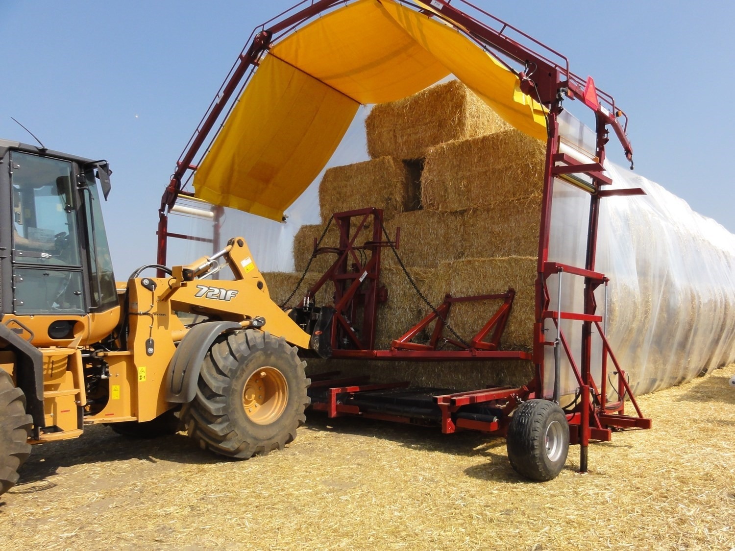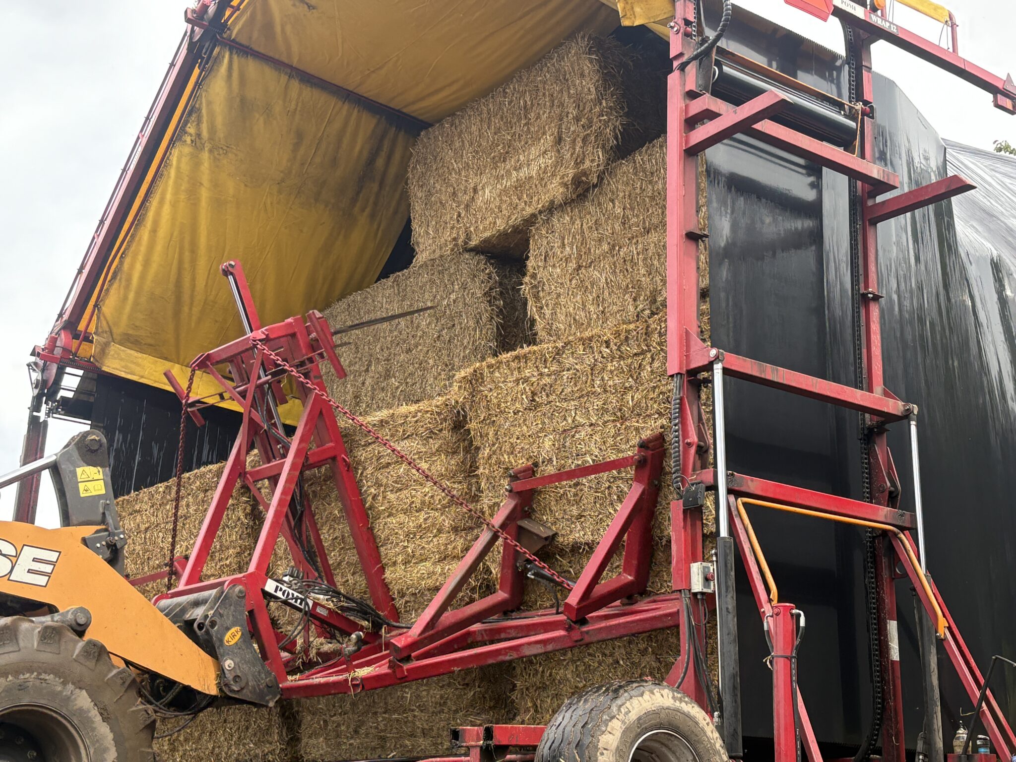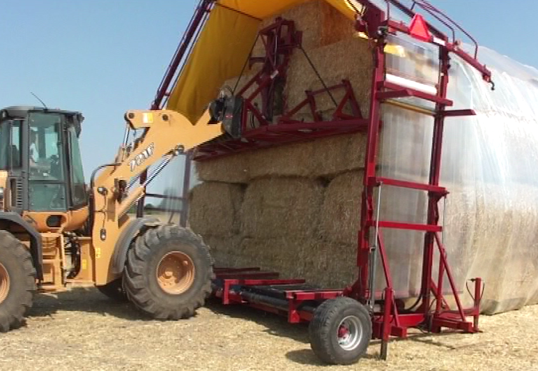 Das Einwickeln erfolgt nach dem bekannten Prinzip: Eine Schlauchfolie wird aufgewickelt, in die die Ballen mithilfe eines Ladewerkzeugs eingelegt werden. So lassen sich viele Ballen in einer Wicklung zusammenfassen und auch bei hohem Verbrauch effizient arbeiten. Trotz ihrer Größe ist die Maschine so konstruiert, dass sie in der Praxis gut handhabbar ist.