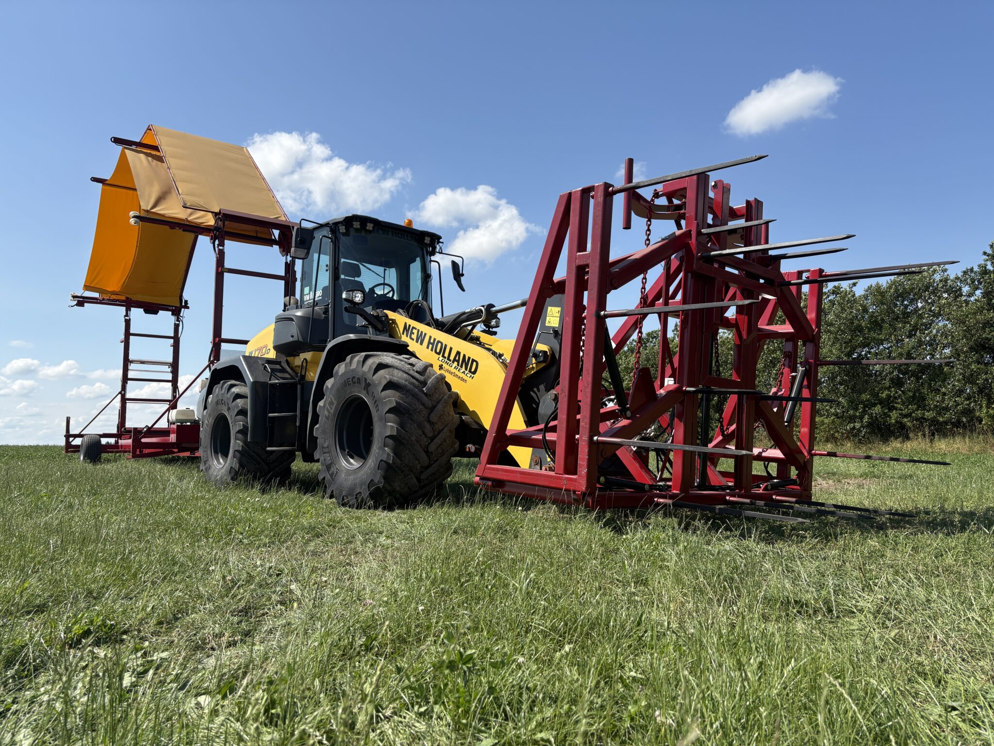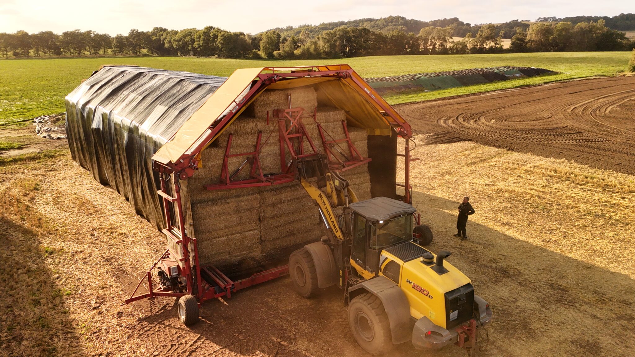 Sobald der Ballenstapel platziert ist, kann die Ballenverpackung per Fernbedienung direkt von der Fahrerkabine der Ladeanlage aus gesteuert werden. Anschließend ist die Maschine bereit für den nächsten Wickelvorgang. Beim Handling und Platzieren der Ballen kann die Lösung durch Hilfsmittel wie Ballenklammern ergänzt werden, um ein kontrolliertes und sicheres Arbeiten zu gewährleisten.